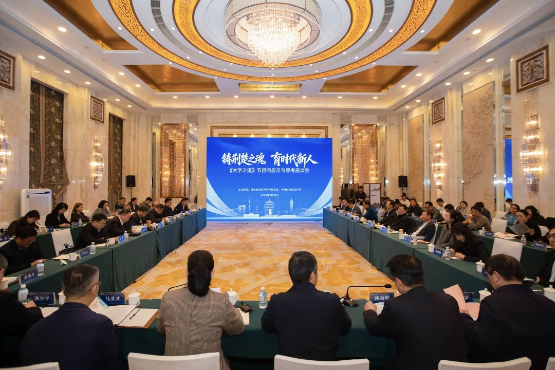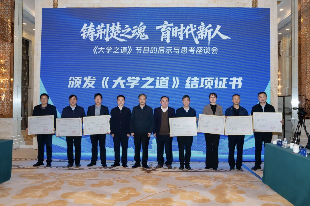 本网讯( 通讯员 章凌 曾智 )3月14日,由省委宣传部和省教育厅指导,湖北省社科联、中南财经政法大学联合主办的《大学之道》节目的启示与思考座谈会在武汉举行。校长龚少平出席座谈会,与来自国家广播电视总局、中国电视艺术家协会、中央广播电视总台、中国广播影视报刊协会,以及复旦大学、中国人民大学等单位的50余名专家学者、行业代表齐聚一堂,围绕高校思政育人赋能等议题展开深入研讨。会上,学校获颁《大学之道》结项证书。