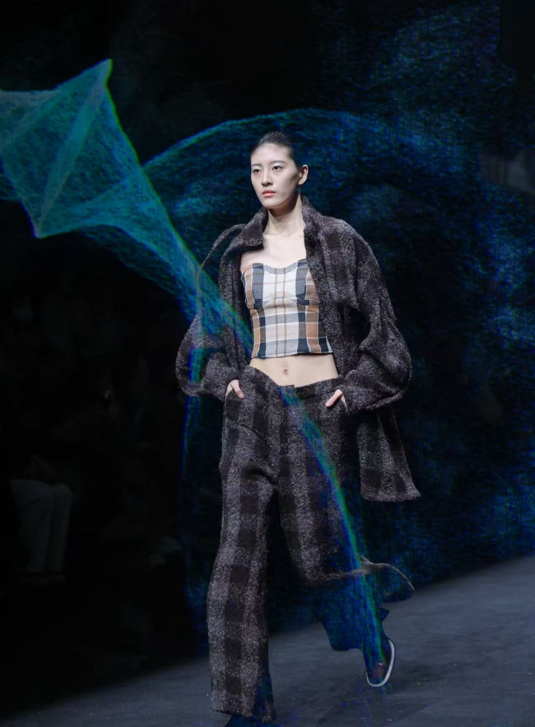 秀场上,模特依次登台,由创新设计研究院团队设计的全息投影画面随之变幻:粒子如织物纤维般飘散、重组,与真人模特形成虚实交织的互动关系,带领观众进入“风”与“织物”共同编织的数字空间。现场观众表示,这不仅是一场服装秀,更像一次完整而沉浸的艺术体验。